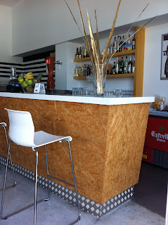 Predomina el color claro de la madera y el blanco de los ladrillos de las paredes. Las instalaciones están medio ocultas con paneles acústicos de fibra en el techo. En medio de este techo cuelga «algo»: una maraña en tonos naturales… ahhh! es una soga liada; le da un toque especial hasta el punto de preferir mirar a otro lugar). Veo que hay farolillos muy naúticos sobre la barra de madera natural y bombillas colgadas que se sortean por todo el local. La iluminación es tenue y agradable y destaca la secuencia de librerías retroiluminadas que cubren la pared a modo de segunda piel y que a la vez dejan entrever el muro descarnado y blanco. La pintura blanca ha tapado directamente todo el continente, sin más capas de protección o acabado, a excepción de 2 pilares de fundición.